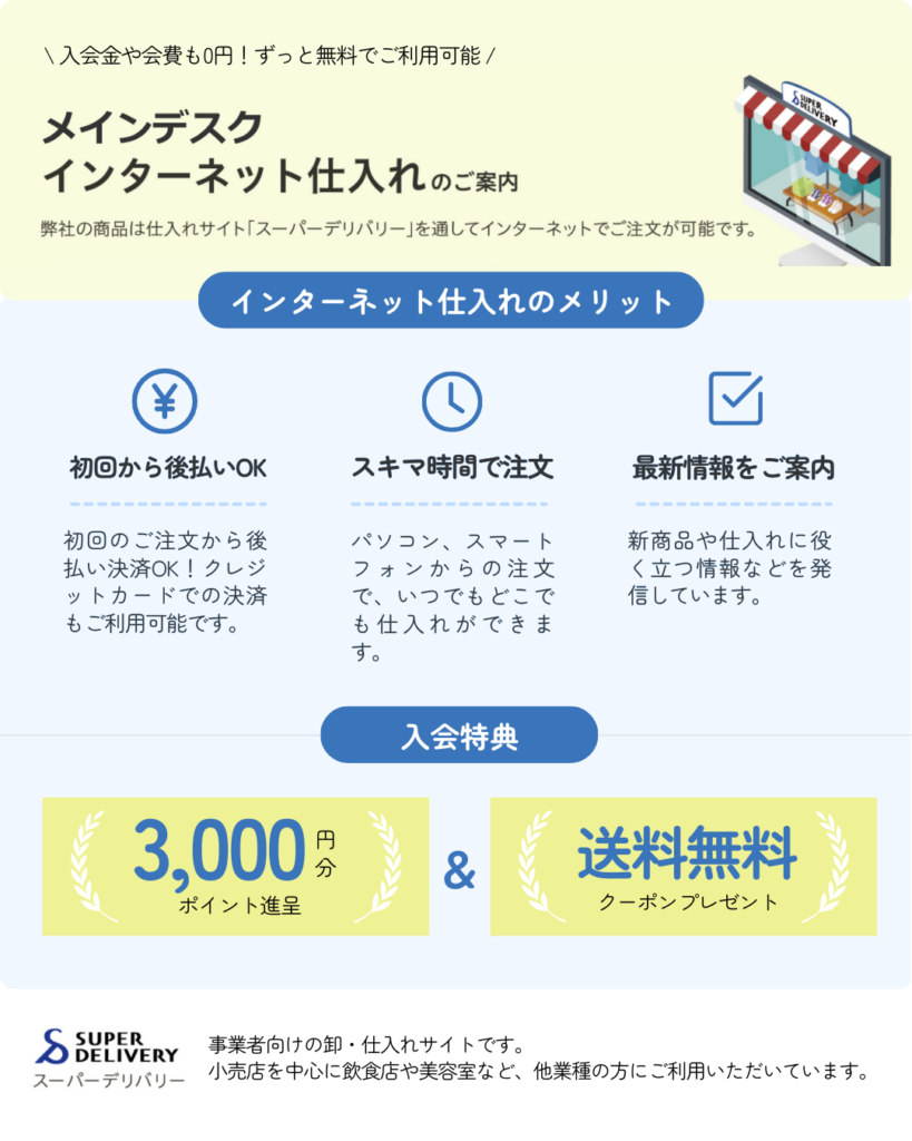 当社 メインデスク株式会社 は、事業者向け卸・仕入れサイト 「スーパーデリバリー」へ商品を出展し始めました。